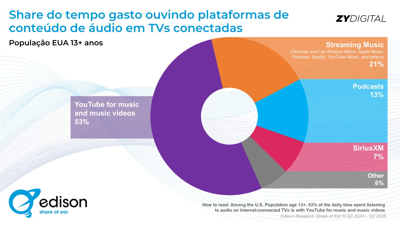 Há poucos dados no Brasil sobre isto, porém, nos EUA, a pesquisa Share of Ear da Edison Research avalia trimestralmente o comportamento dos ouvintes e os seus hábitos de consumo de conteúdo de áudio. Em particular, em sua última edição, referente ao segundo trimestre de 2025, a pesquisa mostrou que americanos com 13 anos ou mais já dedicam cerca de 6% do seu tempo diário de escuta de áudio a TVs conectadas. É um percentual modesto se comparado ao consumo em smartphones ou rádios, mas suficiente para mostrar que o hábito está se consolidando.