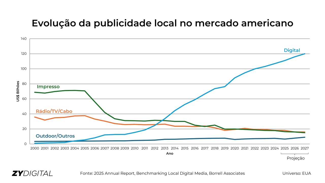 - Dados locais: Pesquisas da Gordon Borrell sobre o destino dos dólares de publicidade local reforçam essa tendência. Enquanto a linha de receita para o rádio, TV e cabo se mostra estável e sem crescimento até 2027, a mídia digital está em uma “jornada de foguete” (“on a rocket ship”).