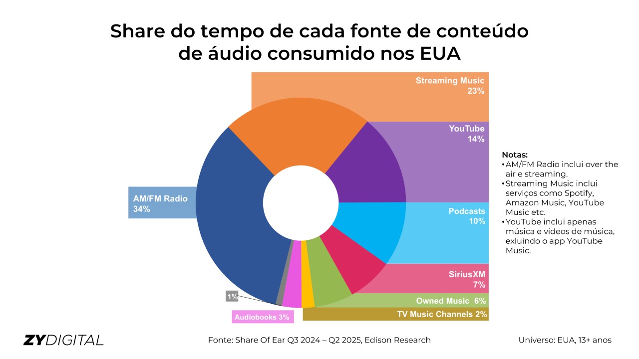 No entanto, quando se consideram os formatos de áudio entregues pela internet, o cenário se expande significativamente. A combinação de diversas fontes online –streaming de música, podcasts, YouTube para música e videoclipes, transmissões de estações de rádio e streaming do rádio por assinatura SiriusXM – totaliza bem mais de 50% de todo o tempo de escuta.