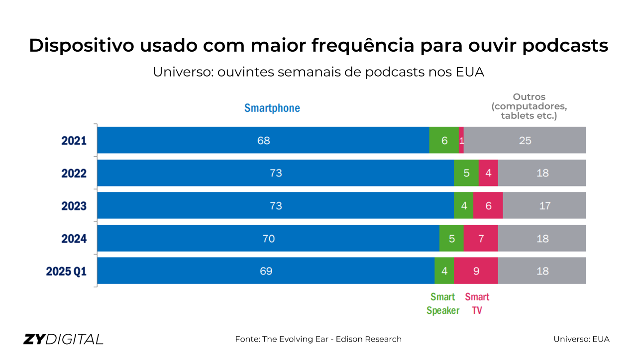 O podcasting está mudando o que se consome nas TVs nos lares americanos. Desde 2021, a fatia de consumidores de podcasts nos EUA que usam principalmente smart TVs para ouvir ou assistir aos episódios cresceu de 1% para 9%, superando o consumo via smart speakers que caiu, no mesmo período, de 6% para 4%.