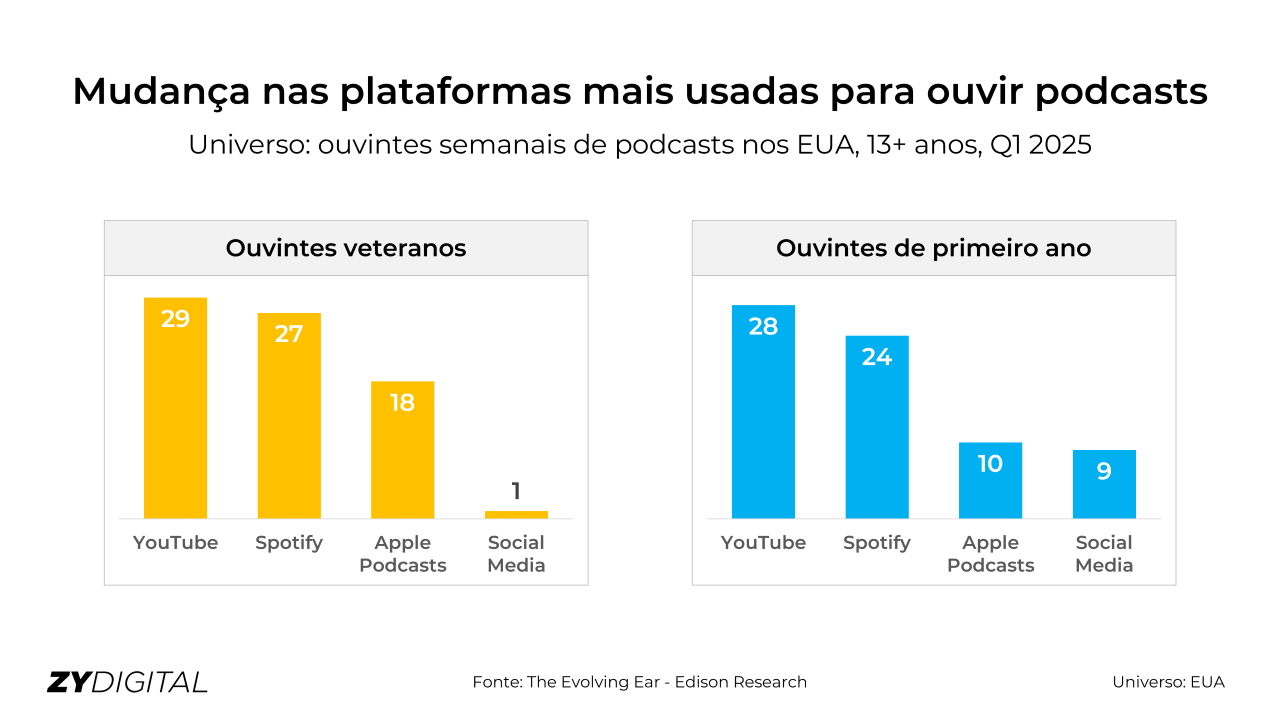 No geral, o YouTube é a plataforma mais utilizada para o consumo de podcasts, alcançando cercas de 3 em cada 10 ouvintes. Na sequência, vêm o Spotify e o Apple Podcasts. Porém, estas duas últimas plataformas apresentam perdas quando se compara o grupo dos ouvintes de primeiro ano com os veteranos. O uso preferencial do Spotify cai de 27% entre os veteranos para 24% entre os ouvintes de primeiro ano, enquanto o Apple Podcasts sofre uma queda bem mais forte de 18% para 10%. Estas quedas podem ser entendidas como um deslocamento do consumo para as redes sociais – os ouvintes de primeiro ano são nove vezes mais propensos que os veteranos de usar plataformas como Facebook, TikTok, Instagram e outras redes sociais como principal meio para consumir podcasts (9% contra 1%).