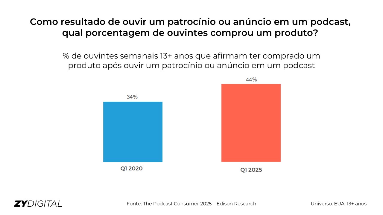 Mais do que isto, a fatia dos ouvintes semanais que comprou um produto após ouvir um anúncio em um podcast é significativa e vem aumentando nos últimos anos – passou de 34% em 2020 para 44% em 2025.