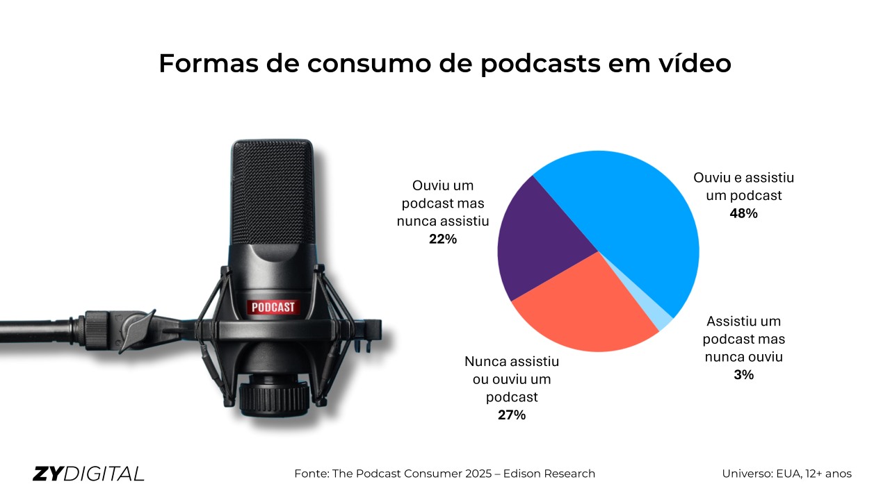 O formato de vídeo vem transformando o universo dos podcasts. Pouco mais da metade (51%) da população dos EUA já consumiu um podcast em vídeo, 37% são espectadores mensais e 26% podem ser considerados habituais (assistiram a um episódio na semana que antecedeu a pesquisa).
