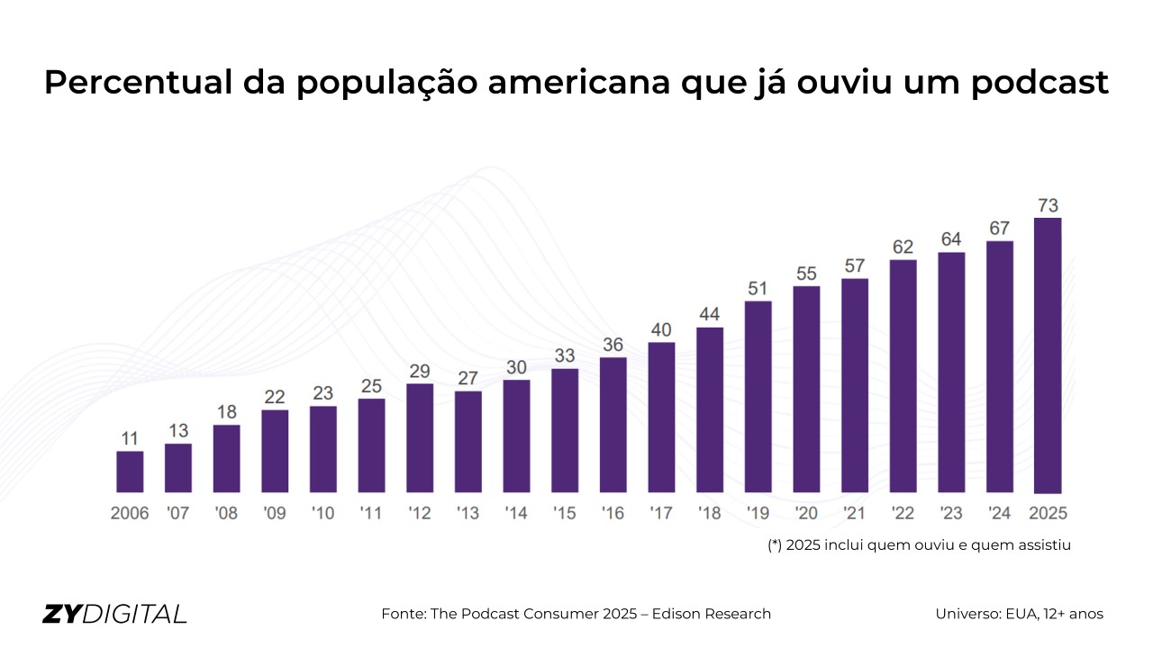 Atualmente, 73% da população norte-americana com 12 anos ou mais já ouviu ou assistiu a um podcast e 55% são ouvintes mensais. O número de ouvintes semanais chegou a 115 milhões, representando 40% da população – um crescimento expressivo quando comparado a 2015.