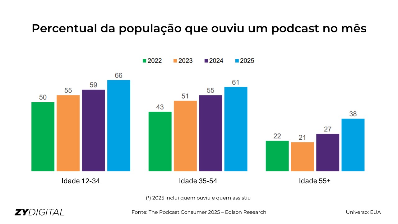 Os podcasts atraem todas as faixas etárias, mas o consumo é especialmente alto entre jovens: 66% das pessoas de 12 a 34 anos são ouvintes mensais, contra 61% entre 35 e 54 anos e 38% entre 55 anos ou mais.