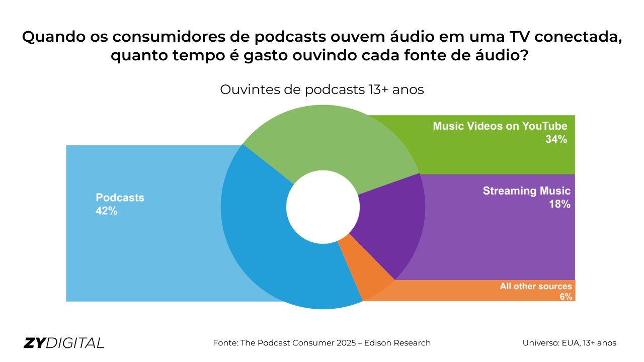 Em TVs conectadas, por exemplo, os podcasts já superam a audiência de videoclipes no YouTube quando o consumo é puramente de áudio.