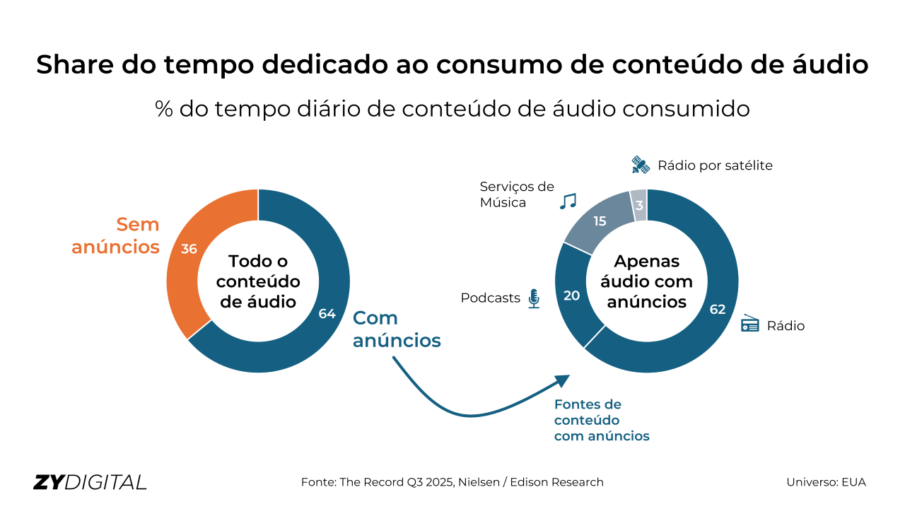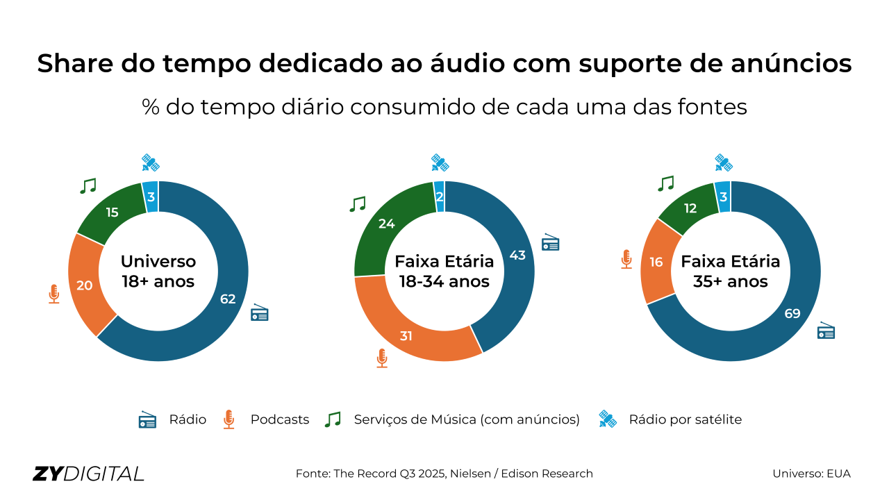 No universo do áudio com anúncios, o rádio convencional AM/FM representa a maior fatia de tempo (62%), seguido por podcasts (20%), streaming de música (15%) e o rádio via satélite SiriusXM (3%).