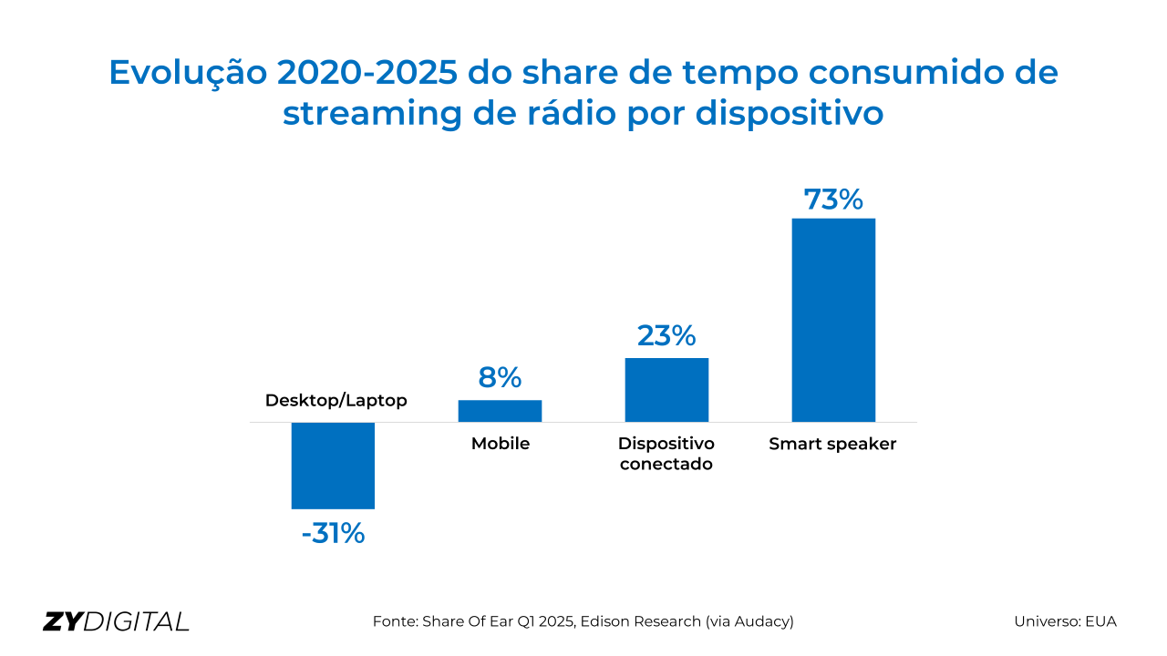 O crescimento no digital reflete tanto o conforto da escuta em casa quanto a popularização dos assistentes de voz. Campanhas de emissoras americanas, que incentivam o público a “pedir para a smart speaker tocar a rádio”, contribuíram para que a audiência se expandisse até entre as gerações mais velhas, que hoje adotam com naturalidade os dispositivos conectados.