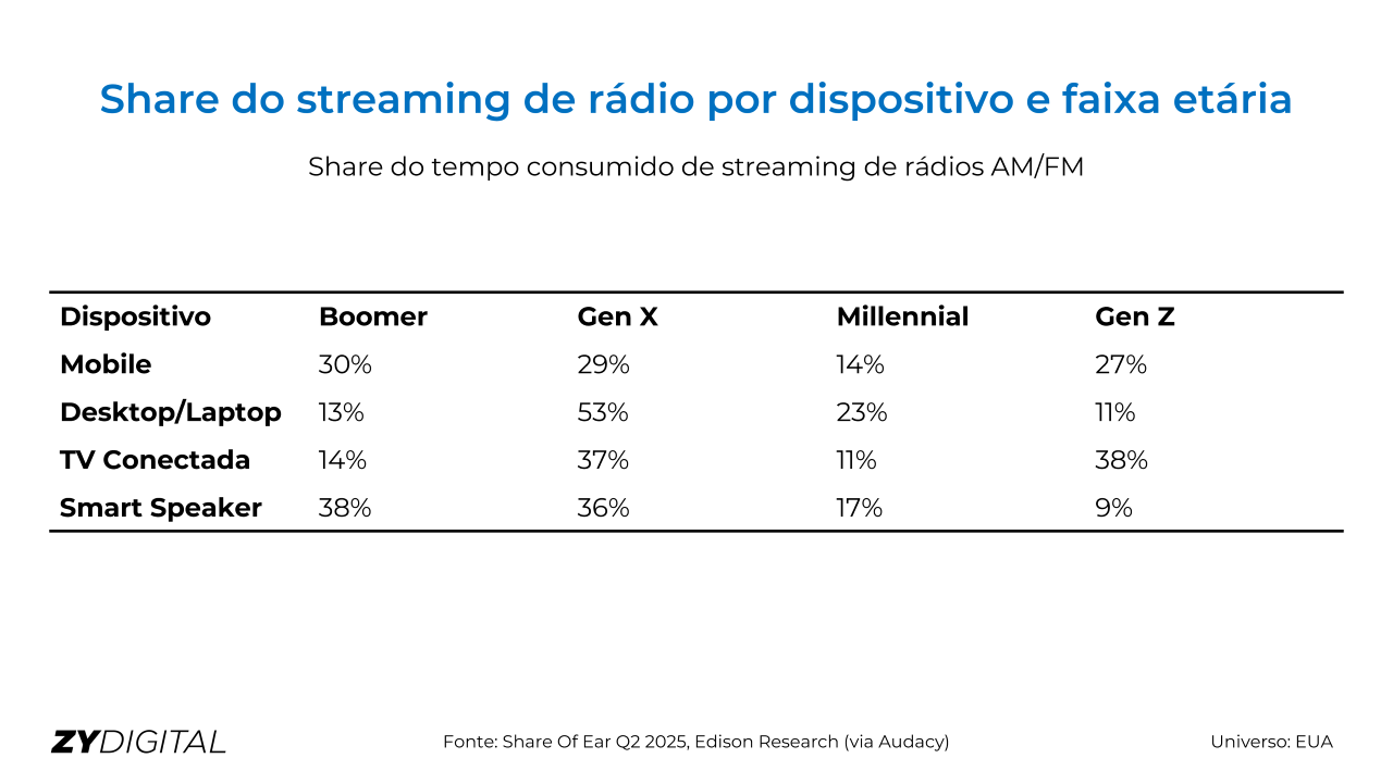 Entre os ouvintes mais jovens, no entanto, a preferência se volta às TVs conectadas. A Geração Z responde por 38% da escuta de AM/FM nesse formato, superando ligeiramente a Geração X (37%). Boomers e Millennials ficam mais atrás, com 14% e 11%, respectivamente. Os dados da Edison sugerem que esse comportamento está ligado ao consumo de áudio em ambientes compartilhados, onde a TV funciona como um centro de entretenimento.